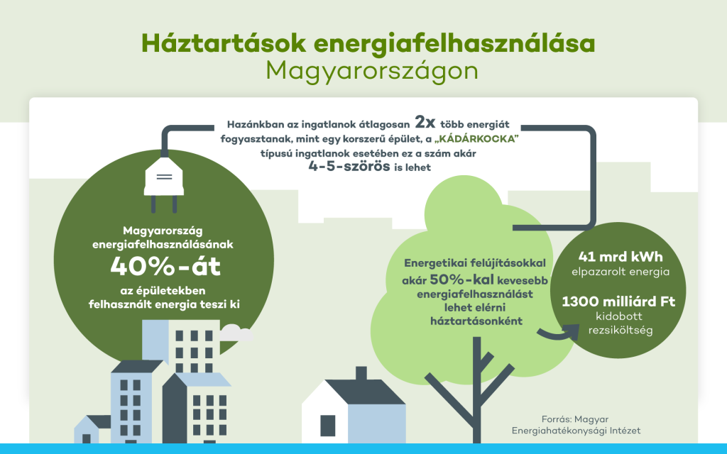 A magyarországi ingatlanállomány nagyrésze rendkívül korszerűtlen, és zabálja az energiát. A KSH adatai szerint a 4,6 milliós hazai ingatlanállományból 2,8 millióra tehető a családi házak száma, amelyek 75 %-a – azaz közel 2,1 millió ingatlan – esetében nem teljesül az elvárt energiahatékonysági szint („C” energiahatékonysági kategória). Egy „Kádárkocka” típusú épület akár 4-5-ször annyi energiát is felhasználhat, mint egy korszerűnek számító épület.