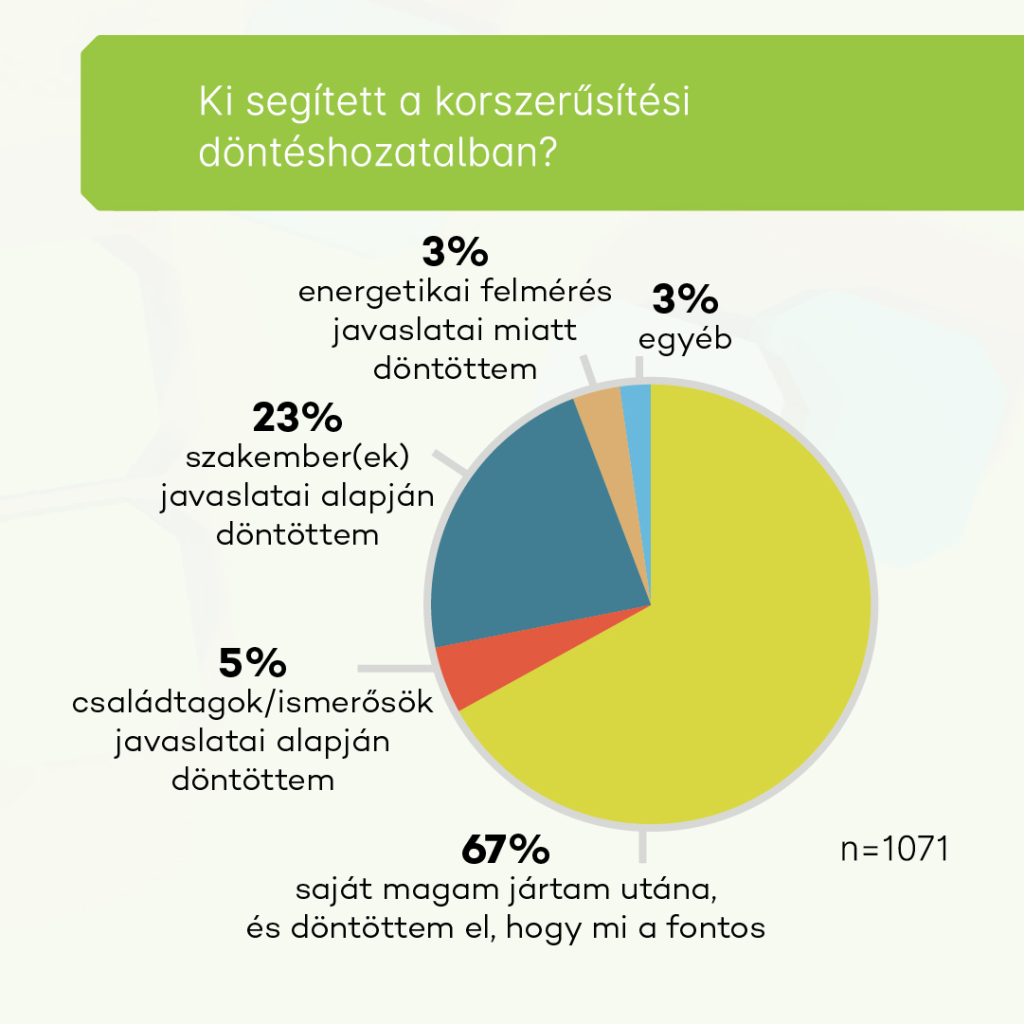 A másik ok, hogy az eddigi felújításokra nem volt jellemző a kellő mértékű energiatudatosság. A válaszadók csupán 3%-a vette igénybe energetikai szakember segítségét, döntő többségük inkább a felújításra spórolt.