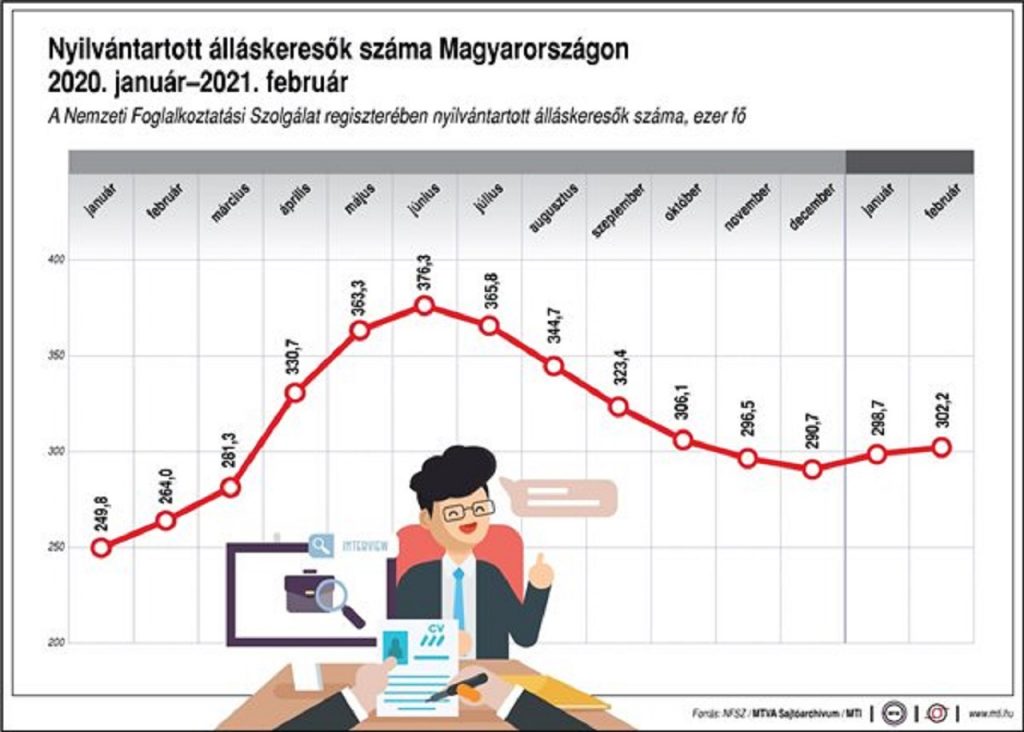 Februárban 75 000 álláslehetőség állt rendelkezésre, amelyből 53 900 betöltetlen maradt. A foglalkoztatók egy hónap alatt 585 munkavállaló csoportos létszámleépítését jelentették be, ami az NFSZ szerint jelentősen elmarad a válság csúcsán, 2020 júniusában bejelentett, a több mint 2300 emberre vonatkozó létszámleépítéstől. Az elbocsátások a szektorok közül a jogi, számviteli, adószakértői tevékenységet, az adminisztratív, kiegészítő egyéb üzleti, valamint a szálláshely-szolgáltatást és a ruházati termék gyártását érintették az ágazatokat érintették Budapesten, valamint Pest, Csongrád-Csanád és Baranya megyében.