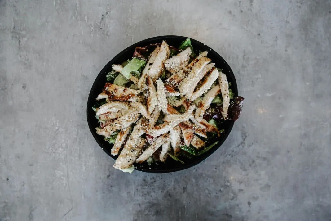 3. Öntsd a salátára, majd add hozzá a csirkecsíkokat.